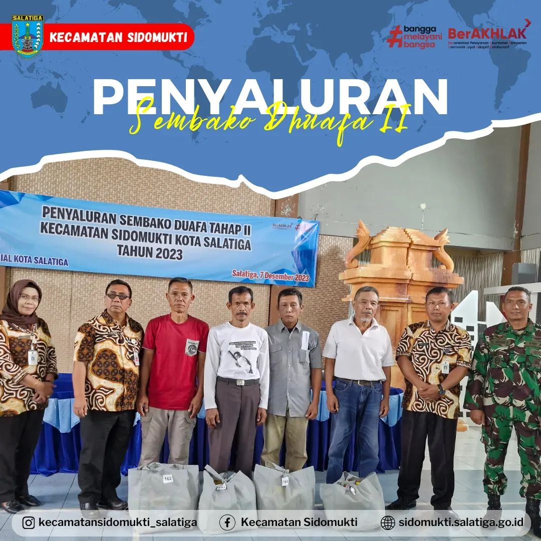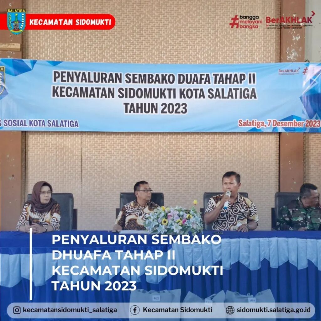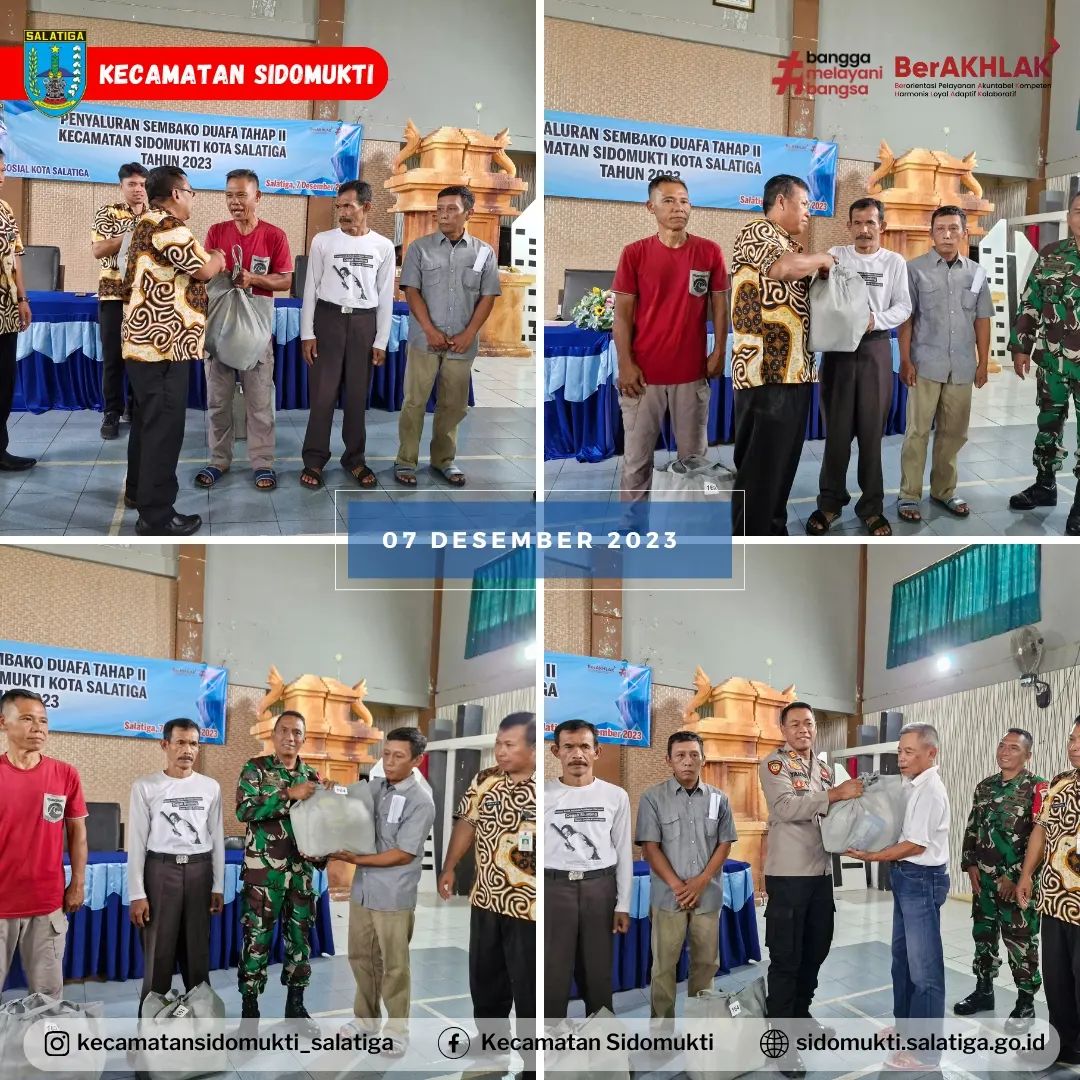 Pada hari Kamis, 07 Desember 2023 telah dilaksanakan Penyaluran Bantuan Sembako Dhuafa Tahap II sejumlah 164 paket yang bertempat di Gedung Merah Putih Kecamatan Sidomukti pada pukul 11.00 hingga selesai. Diharapkan Bantuan Sembako yang telah diberikan berupa Beras, Minyak, Gula Pasir, Susu Kental Manis, Teh Celup dan Mie Telor dapat bermanfaat bagi seluruh penerima.